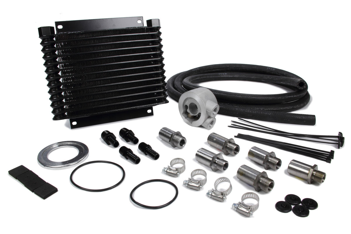 Fluid Cooler - 9000 Series - 10.125 x 8.875 x 1.25 in - Plate Type - 1/2 in NPT Female Inlet / Outlet - Fittings / Hardware / Hose - Aluminum - Black Powder Coat - Engine Oil - Kit