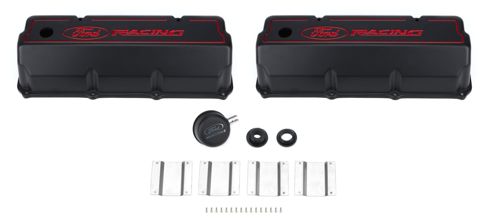 Valve Cover - Tall - Baffled - Breather Hole - Oil Fill Cap - Ford Racing Logo - Aluminum - Black Powder Coat - Ford Cleveland / Modified - Pair