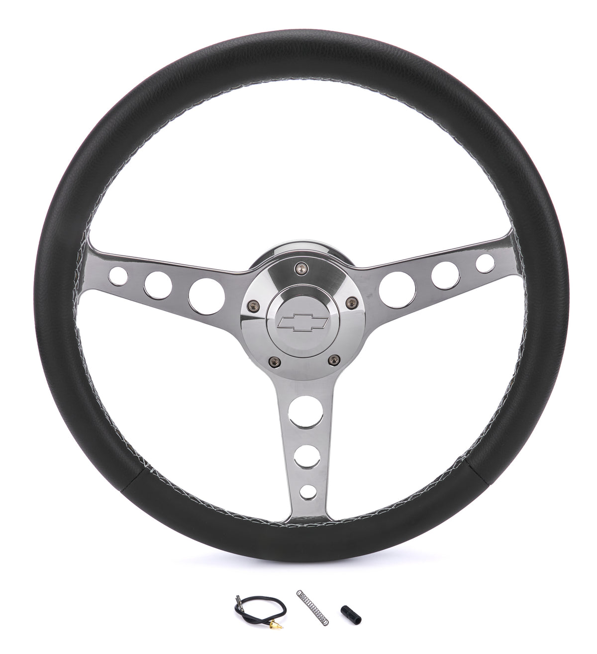 Steering Wheel - Classic Series - 13.75 in Diameter - Flat - 3 Spoke - Black Leather Grip - Chevrolet Bowtie Logo - Aluminum - Polished - GM Fullsize SUV / Truck / Van / GM Compact SUV / Truck / Van 1974-94 - Each