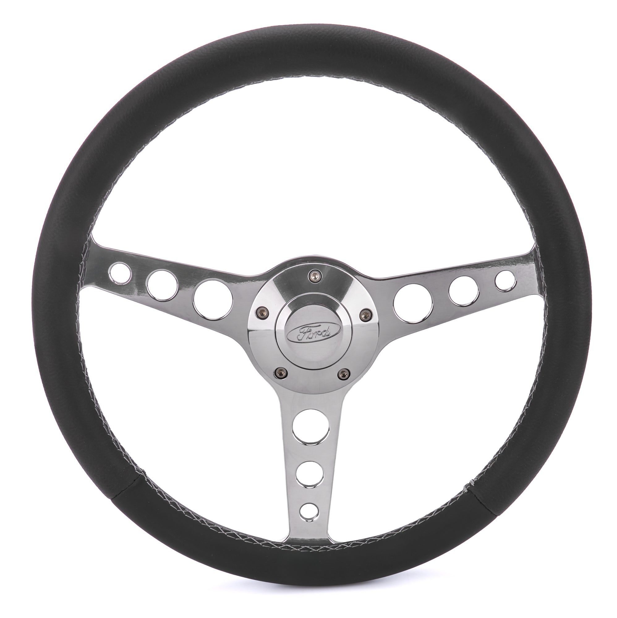Steering Wheel - Classic Series - 13.75 in Diameter - Flat - 3 Spoke - Black Leather Grip - Ford Oval Logo - Aluminum - Polished - Ford 1964-77 - Each