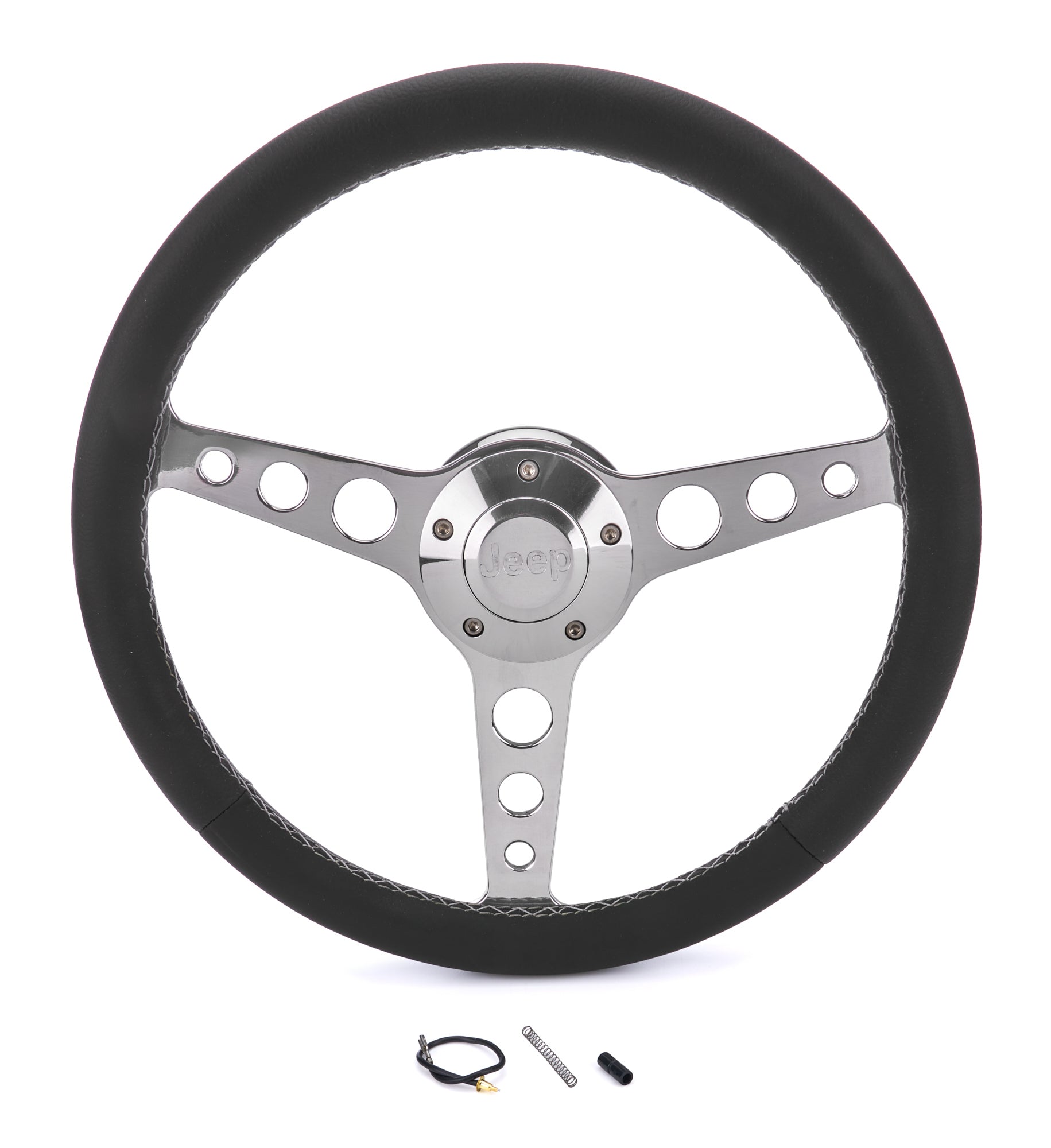 Steering Wheel - Classic Series - 13.75 in Diameter - Flat - 3 Spoke - Black Leather Grip - Jeep Logo - Aluminum - Polished - Jeep 1974-95 - Each