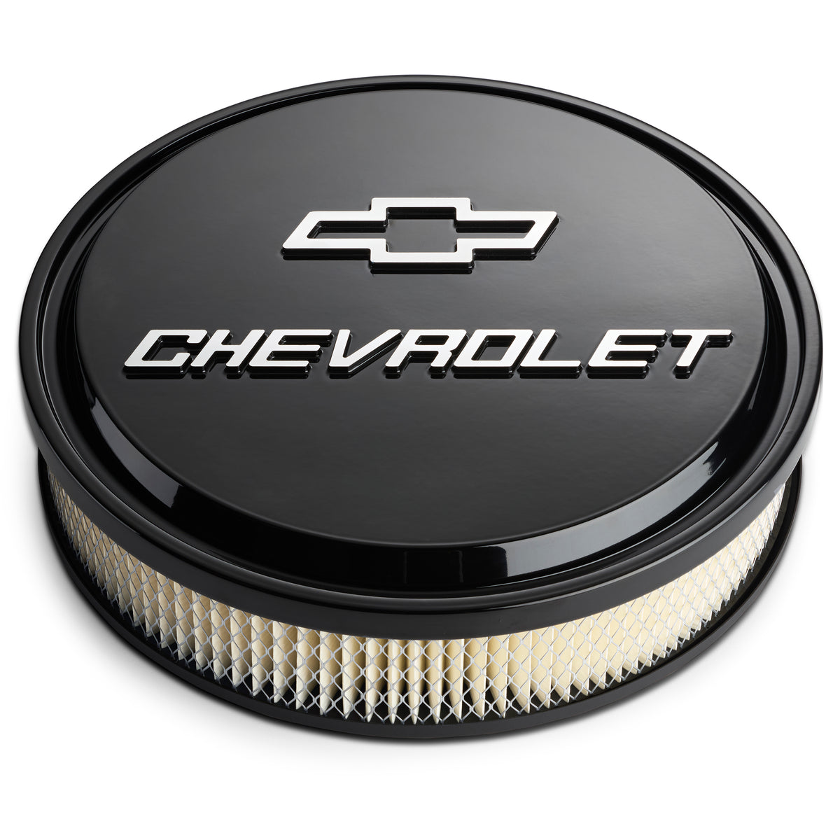 Air Cleaner Assembly - Slant Edge - 14 in Round - 3 in Element - 5-1/8 in Carb Flange - Dropped Base - Chevy Bowtie Logo - Aluminum - Black Powder Coat - Kit